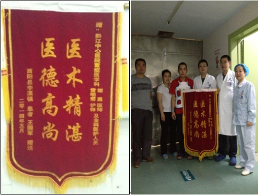 2014年6月11日上午,患者王国军及其家属带着一幅写着“医术精湛 医德高尚 ”的锦旗送到了重庆市黔江中心医院重症医学科的医护办公室,患者对重症医学科全体医护人员的高尚医德及精心护理表达了衷心的感谢。